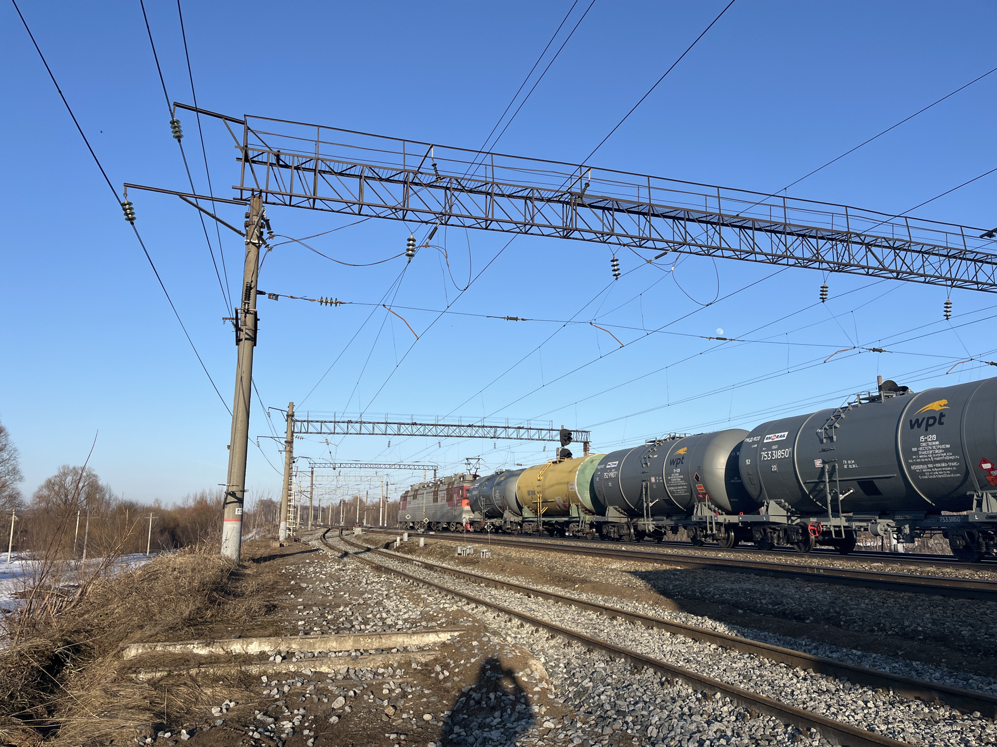 The image depicts a railway scene under a clear blue sky, likely in Kuyeda, Russia, though specific confirmation is impossible without explicit visual cues from the location. The scene shows a railway track with gravel ballast. A train composed of several tank cars is visible on the track. The tanks are of different colors (gray, green, yellow), and some display Russian markings. The tanks have "wpt" logos and are transporting oil. Overhead electrical lines and support structures span the tracks. Patches of bare ground and dry vegetation are on the ground near the tracks, with some lingering snow indicating it is early spring. The image is taken during daytime in clear weather. There are no people visible in the scene.