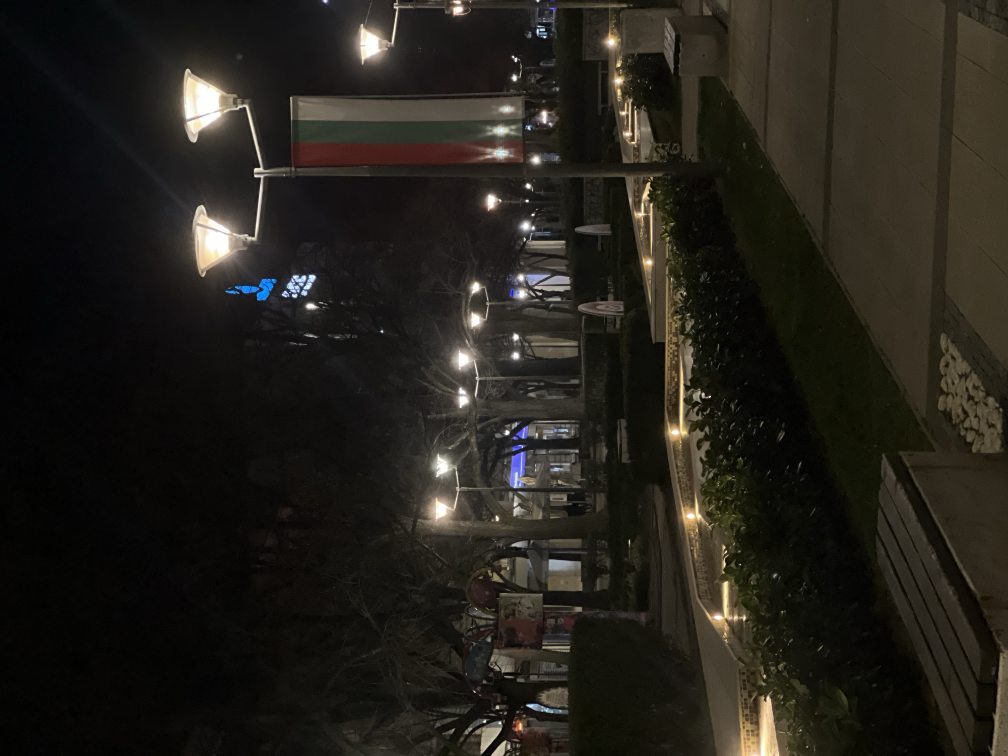 At night in Pernik, Bulgaria, a Bulgarian flag is illuminated by street lamps. The foreground features illuminated walkways lined with manicured hedges. Beyond this, a street stretches into the distance, illuminated by more street lamps and storefronts, appearing to pass through a tree-lined area. The sky is dark.
