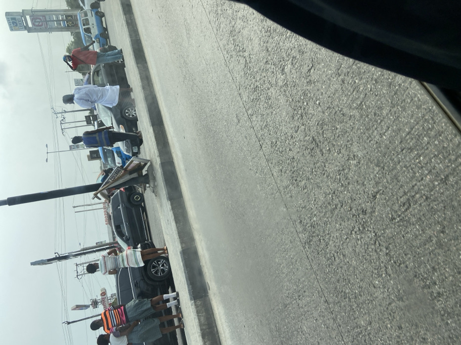 This image captures a roadside scene in Sangotedo, Lagos, Nigeria, specifically near the Novare Lekki Mall, indicated by the prominent "NOVOYE LEKKI" pylon sign and "SHOPRITE" branding visible in the background. The foreground consists of a grey asphalt road and a concrete curb. Along the curb, several individuals are present. On the left, three young individuals stand with their backs to the camera; two wear white shirts, green skirts/trousers, and white socks, consistent with school uniforms, while the third wears a multi-colored striped top and a patterned skirt. They are positioned near a black SUV. Further right on the curb, an individual in a white, traditional-style garment stands near a black sedan. Beside them, another individual wears a blue reflective vest. To the far right, an individual in a red shirt and blue jeans stands on the curb, with their arm raised near their head. Multiple vehicles, including black sedans, a dark SUV, and a blue and white commercial minibus, are present on the road, indicating traffic. Overhead power lines and utility poles are visible against an overcast sky. A wooden sign, partially legible as "COLLEGE," is leaning against a utility pole in the mid-ground. The image is taken from the interior of a vehicle, with part of the vehicle's frame visible on the far right.