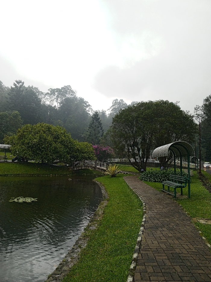 A tranquil park scene features a placid lake edged with green grass and a stone pathway. A small bridge connects the grassy banks. Mature trees surround the lake, with a backdrop of dense forest under a cloudy sky. A covered bench sits beside the pathway, offering a place to rest. A car is visible on the road in the distance.