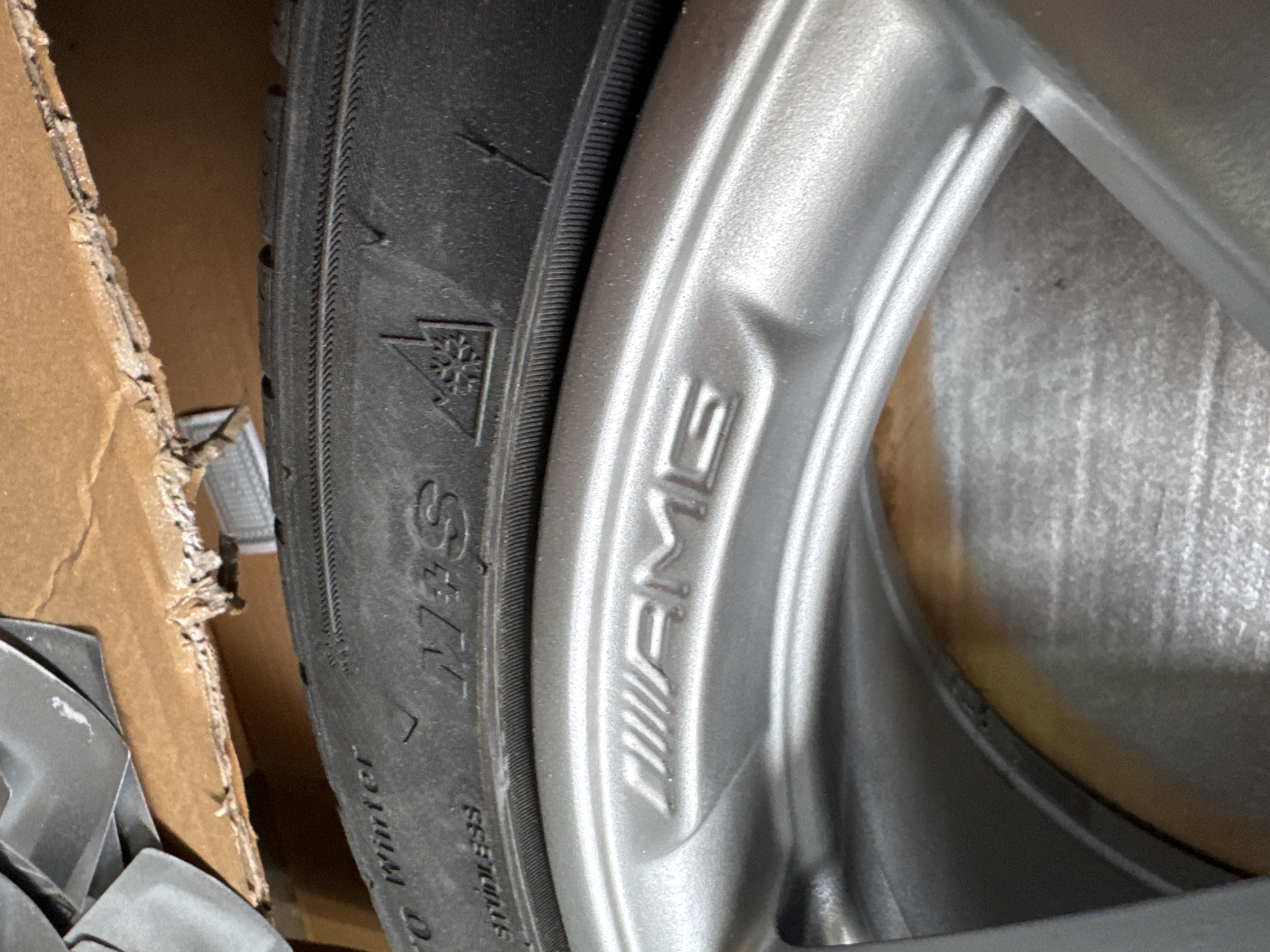 This image shows a tire with the "3PMSF" (Three-Peak Mountain Snowflake) symbol indicating it is a winter tire, and a silver AMG wheel. The tire is labeled "Winter". The scene takes place in an area with cardboard packaging. There is no evidence indicating a location in Silistra, Bulgaria.