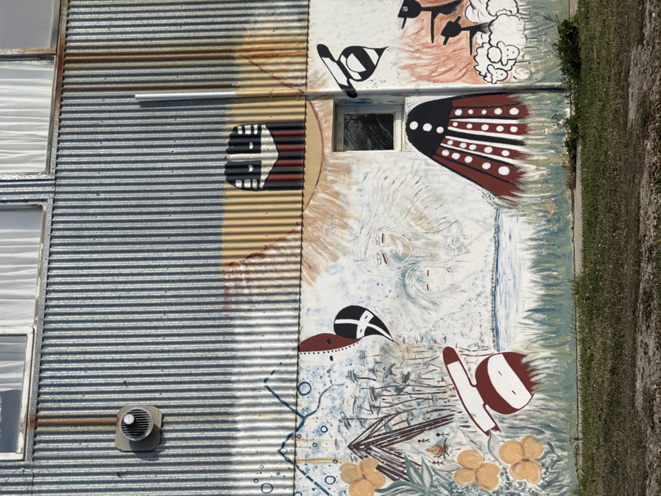 A section of an exterior building wall is depicted in Tolhuin, Argentina, illuminated by direct sunlight. The upper portion of the wall consists of vertical, corrugated galvanized metal siding, exhibiting areas of rust and discoloration. Two windows with white curtains are visible at the very top. A circular, louvered metal ventilation fan is affixed to the corrugated siding on the upper left. A rectangular segment of the corrugated metal in the upper right features a painted stylized face or mask, rendered in black, white, and red. The lower two-thirds of the wall are covered by a multi-panel mural painted over a light base coat, showing signs of wear and paint flaking. The mural depicts various scenes and stylized figures. On the left, a landscape features blue lines suggesting mountains, yellow-orange flowers, and green foliage. A triangular, dark-brown structure resembling a dwelling stands among sparse trees, with small, stick-figure human forms nearby, one appearing to tend a small fire. A red and white abstract shape is present in the lower-left. Above the center-left, a stylized black and white mask-like shape with a red outline is painted. The central part of the mural portrays several figures with long, flowing white hair and red facial markings, set above a blue body of water. A small, rectangular window with a dark pane is integrated into this section of the mural, to the right of the central figures. To the right of this window, a large, bell-shaped figure in red and black with white dots and vertical stripes stands over green, grass-like strokes. Above this, another stylized black and white mask-like shape is depicted. The far-right section of the mural presents an orange-hued background with black, silhouette-like figures, possibly birds, and white, puffy shapes, likely sheep, in the lower right corner. The ground directly in front of the wall consists of sparse, dry green grass and exposed soil.