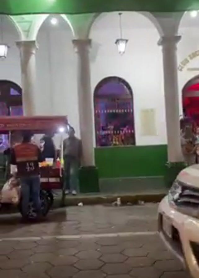 building exterior at night. The building is white with arches and columns, illuminated by hanging lights. A green banner above the building reads "SIEMPRE LIBRES CRUCENOS". A food cart is visible on the left, and a man stands near it. Several cars pass by, including a white SUV, a red station wagon with a roof rack, and a white hatchback. The building interior is lit with blue and red lights. The street is paved with a geometric pattern.