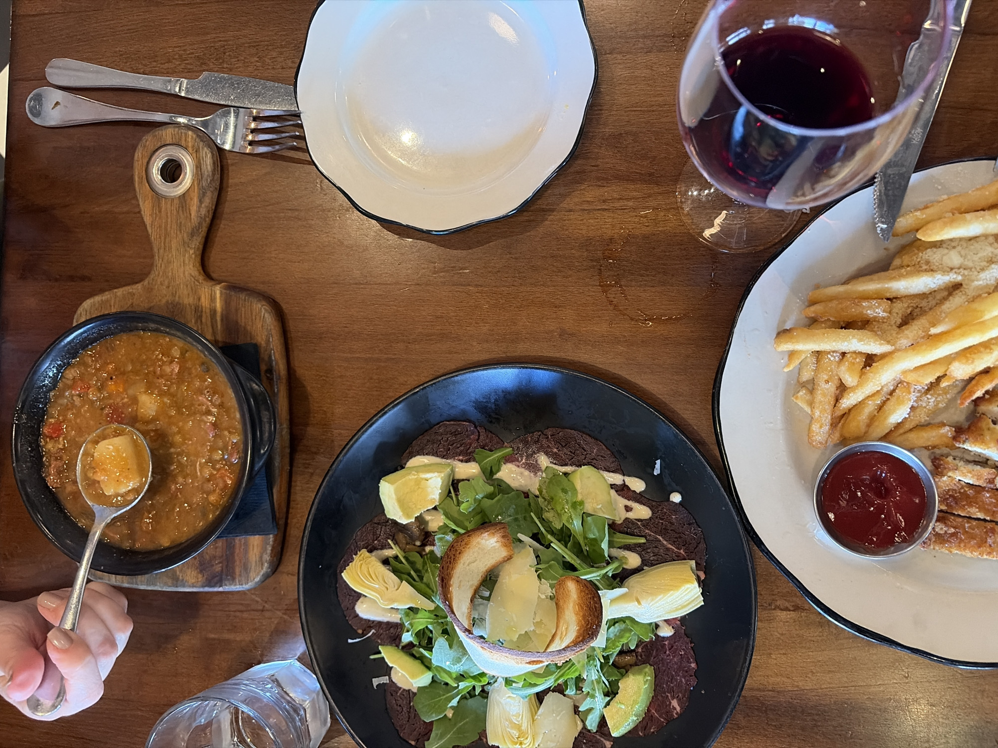 wooden table with a variety of food and drink items arranged on it. From left to right: A small wooden cutting board with a dark bowl of stew or soup being held by a hand with a silver spoon scooping out some of the stew. Next to it is a black plate containing a salad with meat or carpaccio, greens, artichokes, avocado, bread, and a creamy sauce. Above the stew is a white plate with a black rim and a fork and knife resting on it. To the right is a wine glass filled with red wine and another white plate with a black rim containing french fries, a small dish of red sauce, and possibly some chicken cutlets. The setting appears to be a restaurant in Key Biscayne, United States of America. The environment seems to be that of a casual dining experience. No people are fully visible in the image except for a hand holding a spoon.