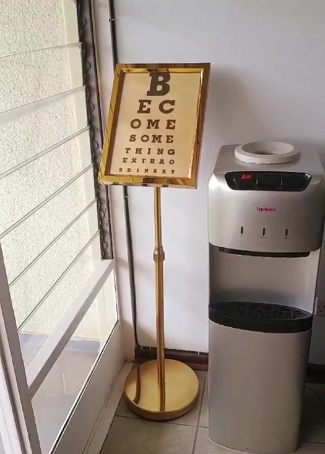 corner of a room, focusing on a water cooler and an eye chart-style artwork. The room has a white wall on one side, against which the water cooler and the art are placed. To the left is a window with white blinds, creating vertical lines. The water cooler is a two-tone silver appliance with a black base. It has a red light on top and the brand name "Top Notch" printed on the front. Next to it is a golden-framed art piece on a stand. The art is designed like an eye chart, with the text "BECOME SOMETHING EXTRAORDINARY" written in black capital letters on a beige background. The stand is made of a shiny gold material with a circular base. The floor appears to be tiled. The video is still and does not show any people or actions.