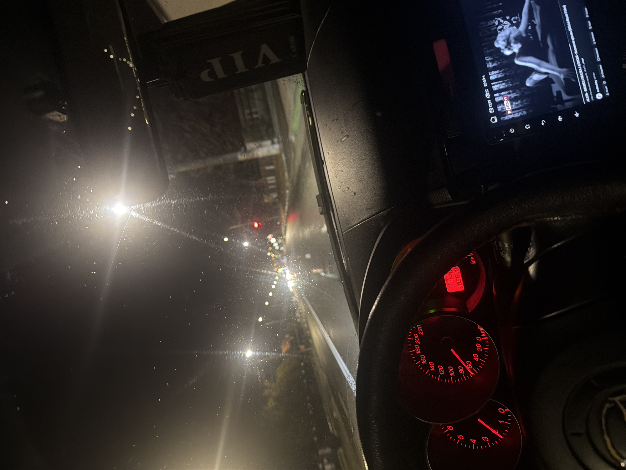 The image depicts the interior of a car, presumably at night, as seen from the driver's perspective