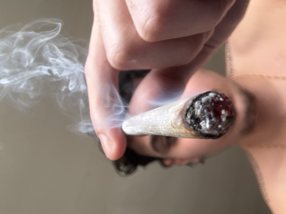 A close-up image depicts a human hand holding a lit, hand-rolled smoking article, commonly identified as a joint, emitting a prominent plume of white smoke