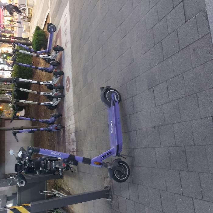 The image presents an urban street scene at dusk or night in Gimpo-si, South Korea. In the foreground, a purple "Beam" electric scooter lies horizontally on its left side across a gray-tiled sidewalk. To the left, a dark gray utility pole with a yellow and black striped warning decal is visible, adjacent to a metal bicycle rack. Behind the rack, a dark-colored scooter or motorcycle, partially branded "VICTORY," is parked upright. In the midground, a designated parking zone on the pavement, marked by a white painted rectangle, contains a line of seven upright shared electric scooters. This row consists of four purple "Beam" scooters and three white scooters with black accents, possibly of a different brand. Behind these parked scooters, a strip of ground with trees and low-lying shrubs separates the sidewalk from a street. The background reveals a street with illuminated storefronts and buildings beyond the trees. A person on a bicycle is visible in motion, moving away from the viewer on the far right side of the street, and another indistinct figure is present further down the street. Streetlights are active, indicating low ambient light conditions.
