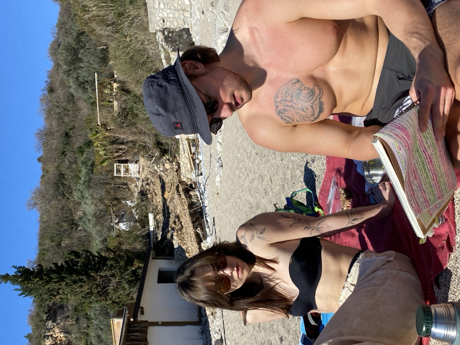The image depicts two individuals seated on a red blanket on a rocky beach in Drobnići, Montenegro, under a clear blue sky. On the left, a female with dark, shoulder-length hair and sunglasses wears a black strapless bikini top and light-colored baggy pants. She has vine-patterned tattoos on her left arm, extending from the shoulder down. She is looking downwards and slightly to the right. On the right, a shirtless male with light brown hair, sunglasses, and a dark gray bucket hat featuring a red Jordan logo is present. He wears dark swim shorts and has a large tiger head tattoo on his upper left chest. He holds an open spiral notebook with visible writing and highlighting in both hands, looking down at its contents. Between the individuals, on the red blanket, a clear plastic container with nuts and a silver metal bowl are visible. To the left of the female, a silver thermos with a green cap rests on the blanket. The background consists of white, single-story buildings with wooden accents positioned at the edge of the beach. Behind these structures, a steep, vegetated hillside rises, featuring sparse trees, bushes, and some visible rocky sections with debris and remnants of structures. A tall cypress-like tree is prominent on the left side of the hillside. A small, light brown animal, possibly a dog or cat, is visible on a path on the hillside. The scene is illuminated by bright natural sunlight.