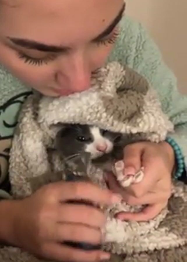 A young person with long dark eyelashes is trimming the nails of a kitten