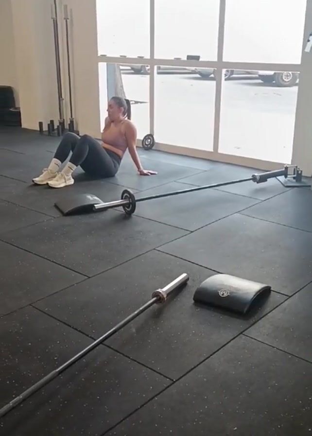 A young woman is sitting on the floor in a gym. She has dark hair pulled back in a ponytail and is wearing a mauve-colored sports bra and dark leggings. She is leaning back on one arm, with her knees bent and feet flat on the floor. In front of her are two barbells and two black pads. The floor is covered in black rubber mats. Behind her is a large window that looks out onto a parking lot. There are other gym equipment in the background.