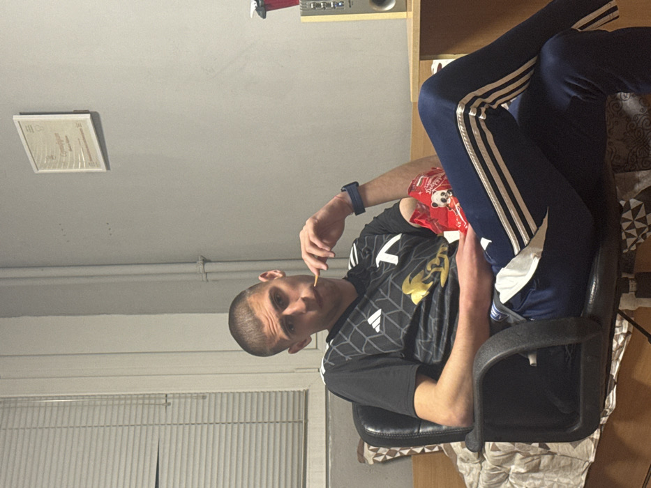 A young male with a buzz cut and a neutral expression is seated in a black office chair, facing the camera