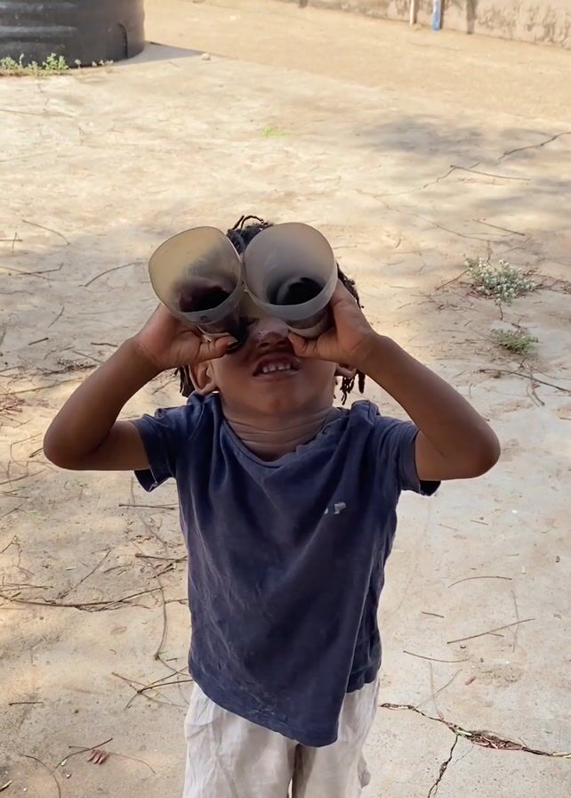 young child standing in a sandy, cracked concrete area, looking through two large, translucent plastic cups held up to their eyes like binoculars. They are wearing a dark blue t-shirt and light-colored shorts, and their bare feet are visible. Their hair is in small dreadlocks or twists. Behind the child, there is a large black water tank, a fence, and some scattered weeds and debris on the ground. The scene is brightly lit, suggesting it is outdoors during the day.