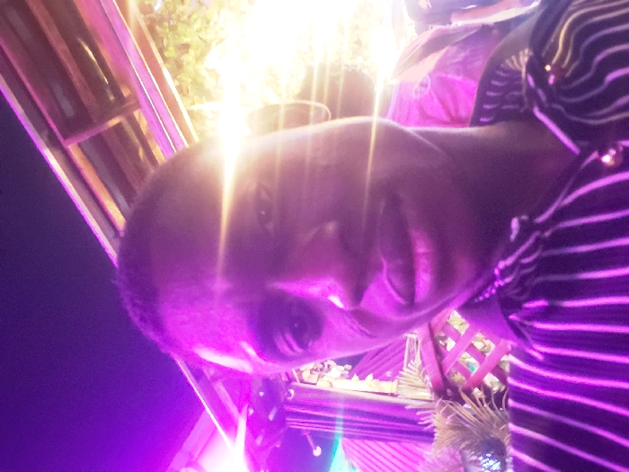 A close-up portrait captures a person with dark skin illuminated by a bright white light above and a strong purple glow from below. The individual has short, dark hair and is wearing a striped shirt. The image is tilted, and the background reveals hints of an outdoor setting with what appear to be plants and latticework. The lighting creates strong contrasts and highlights certain features of the face, obscuring others.