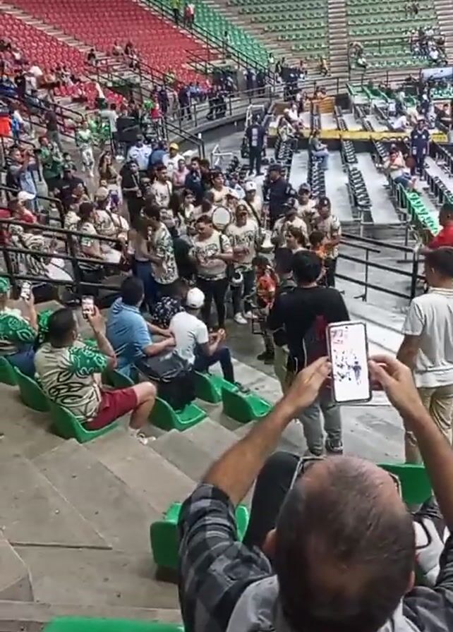group of musicians performing in a stadium. They're dressed in matching outfits, and the camera appears to be held by someone sitting in the stands, who is filming the performance with their phone. Other people in the surrounding seats are also holding up their phones to record. The stadium has green, red, and gray seating sections, and there are spectators scattered throughout.