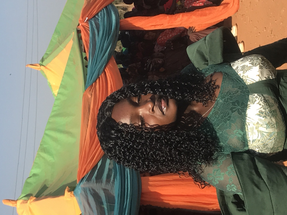 A woman with dark skin and curly black hair reclines. She wears a green lace top and a matching dress with white and gold patterned fabric on the bodice. Draped fabrics in orange, green, blue, and yellow form a colorful backdrop, possibly decorations for an event. Other people are seated in the background, and the ground appears to be sandy or dusty. The photo is rotated sideways.