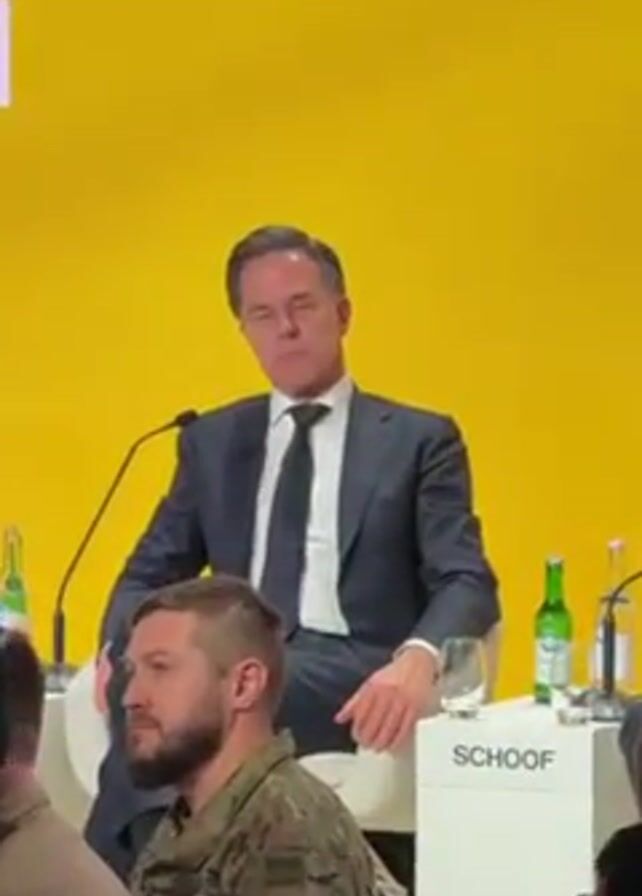 man wearing a suit sitting at a table on a stage in front of a yellow backdrop. The man is Mark Rutte, the Prime Minister of the Netherlands. There are other people sitting at the table, and in the audience. The man in the suit is looking into the camera. There is a microphone in front of him and a bottle of water. The name of the company “SCHOOF” is printed on the table. The title "Ukrainian Bridge" is on the backdrop.