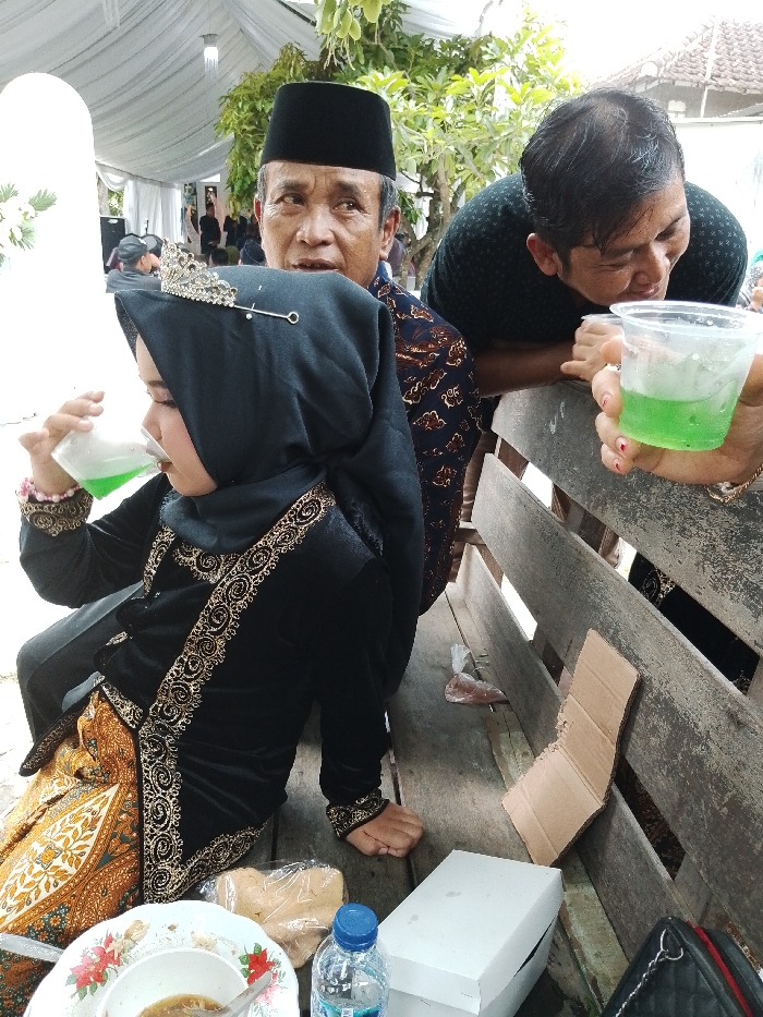 The image captures an outdoor social gathering in Juwana, Indonesia, beneath a white fabric canopy. In the foreground, a young individual, likely a child, sits on a rustic wooden bench. They are dressed in a black traditional garment with ornate gold embroidery and a black hijab, embellished with a silver tiara-like accessory, while drinking a light green liquid from a clear plastic cup. Directly behind this individual is an older man wearing a black peci and a brown batik-patterned shirt, looking towards the left side of the frame with a focused expression. To his right, another man, younger, leans forward onto the wooden bench back, holding a clear plastic cup containing the same green liquid and observing it with a slight smile. On the bench to the left of the young person, a white plate with a floral design contains a small amount of food and a spoon. Adjacent to it are a bottled water with a blue cap, a clear plastic bag holding light-colored snacks, and a white cardboard box. A black quilted bag is visible on the far right, partially obscured by the bench slats. A piece of bent cardboard and a small plastic bag are on the ground beneath the bench. The background is blurred, showing additional attendees, green foliage, and distant roof tiles, suggesting a residential or communal outdoor area.