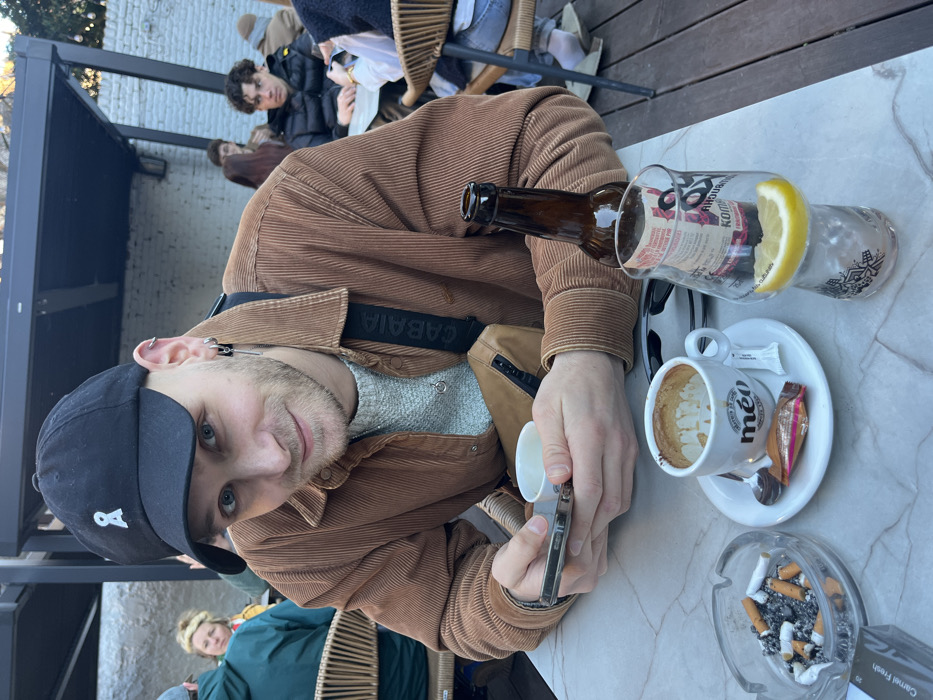 The scene is an outdoor cafe terrace located in Lille, France. A young adult male is centrally positioned, directly facing the camera with a slight smile. He has a light beard, multiple ear piercings, and wears a black baseball cap featuring a white ribbon-like logo, a light-colored crewneck sweater, and a brown corduroy button-up shirt. A tan crossbody bag, with "CABAIA" visible on its strap, is worn over his right shoulder. He holds a smartphone horizontally in both hands. On the light-colored, possibly marble-patterned table in front of him, an empty white coffee cup from "méo Lille" sits on a saucer with a spoon, a sugar packet, and a wrapped piece of chocolate. Next to this, a clear glass ashtray is filled with cigarette butts and ash, with a 'Camel Fresh' cigarette pack underneath. To the right, a brown glass bottle, partially labeled "Kombucha," stands next to an empty clear glass containing a lemon slice. Black sunglasses are also on the table. In the background, other patrons are seated at tables. A person in a green jacket is partially visible to the left, and another individual in a black puffer jacket is seated further back to the right, looking away. The environment includes a light-colored brick wall and a dark metal overhead pergola structure, indicative of an outdoor seating area.