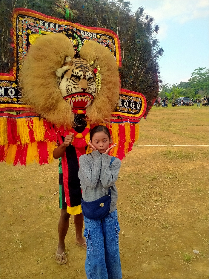 - "This image captures an outdoor scene in an open field in Sidomukti, Indonesia, featuring a young girl posing in front of a performer in a traditional Reog Ponorogo costume" by FM-3Xduo1, licensed under CC BY 4.0