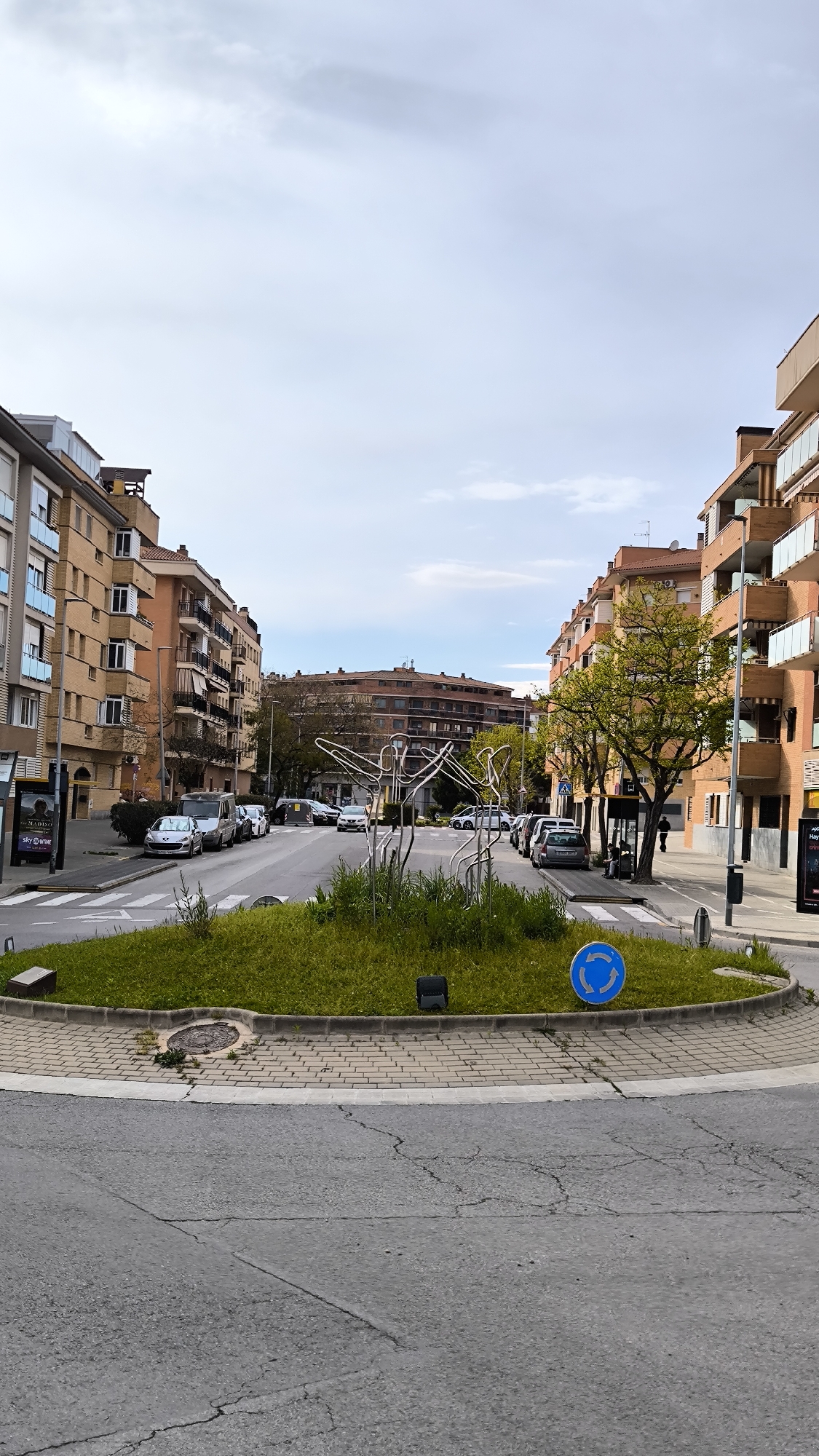 The image depicts a street scene in Ripollet, Spain. A roundabout dominates the foreground, featuring a central grassy area with a circular brick border. A blue road sign with white arrows indicating a circular traffic pattern is visible on the edge of the roundabout. Within the grassy area is a modern metal sculpture. The surrounding area consists of apartment buildings lining both sides of the street. Several parked cars are visible along the street. There are pedestrians visible on the sidewalks. The sky is overcast.