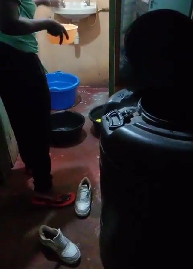 Here is a detailed description of the video: A person is pouring water from an orange container into a black bowl, which is placed on the floor. The person is wearing a light green shirt, black pants, and red flip-flops. Two pairs of shoes are on the floor near the person. The scene appears to be in a small room, possibly a laundry or utility room. There is a sink mounted on the wall with two faucets. Behind the bowl is a blue plastic bucket. A large black water tank with an open lid is on the right side of the frame. The lighting is somewhat dim.