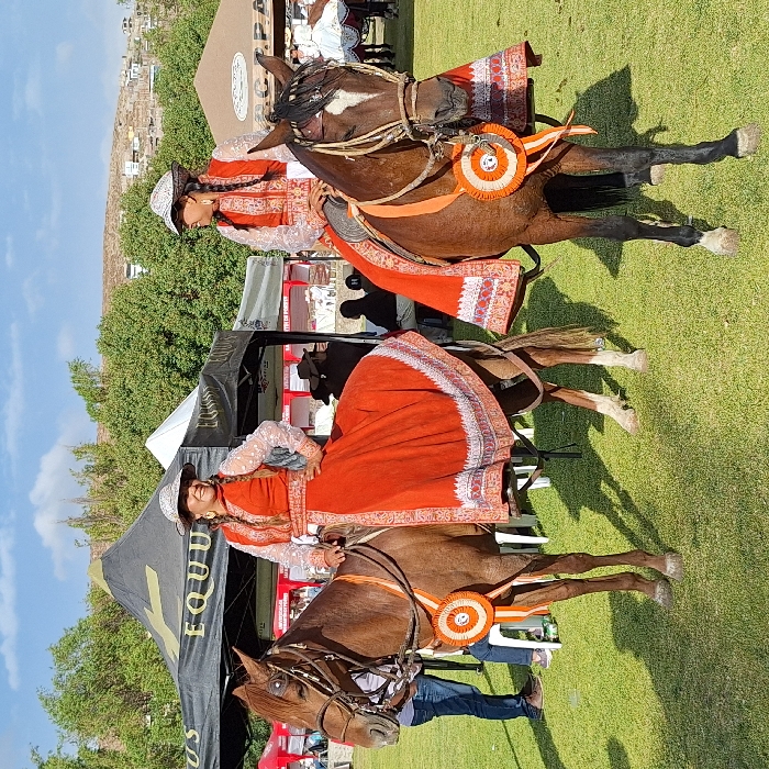 - "Two women wearing traditional red dresses and embroidered headwear are riding horses on a grassy field" by FM-b0Aw43, licensed under CC BY 4.0
