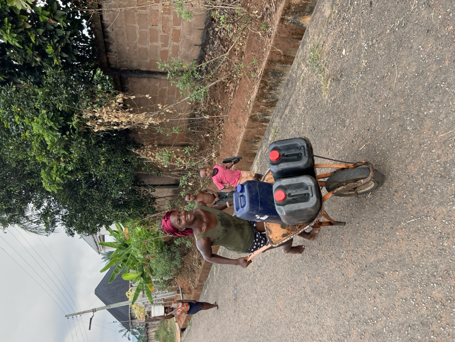 The scene, set on anaved road in Nnobi, Nigeria, depicts four individuals under an overcast sky. In the foreground, a barefoot woman with dark skin, wearing a dark green tank top and patterned shorts, pushes an orange, weathered wheelbarrow containing one blue plastic jerrycan and two black plastic jerrycans with red caps. She has a red headscarf and a smile directed towards the camera, with visible perspiration on her skin. Following her are two barefoot young boys: one in dark shorts, and another in a pink t-shirt and light shorts, holding a dark object in his left hand. Further down the road, a second barefoot woman walks away from the camera, clad in a patterned top and dark skirt, balancing a white bucket on her head. The road surface is a mix of dirt and gravel. To the right, a concrete drainage channel borders a reddish-brown brick wall, partially obscured by dense green foliage and dried vines. To the left, a dirt bank rises towards green vegetation, including banana plants, and a building featuring a dark, pitched roof and light-colored walls. A utility pole with overhead wires is also visible.
