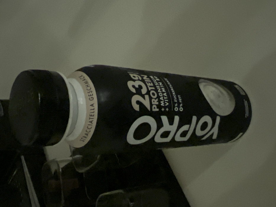 A black Yopro protein drink bottle lies horizontally. It's labeled "23g Protein" with added magnesium and vitamin B6. The flavor, "Stracciatella Geschmack," is printed near the black cap. The label indicates "0% Zuckerzusatz" (no added sugar) and "0% Fett" (0% fat).