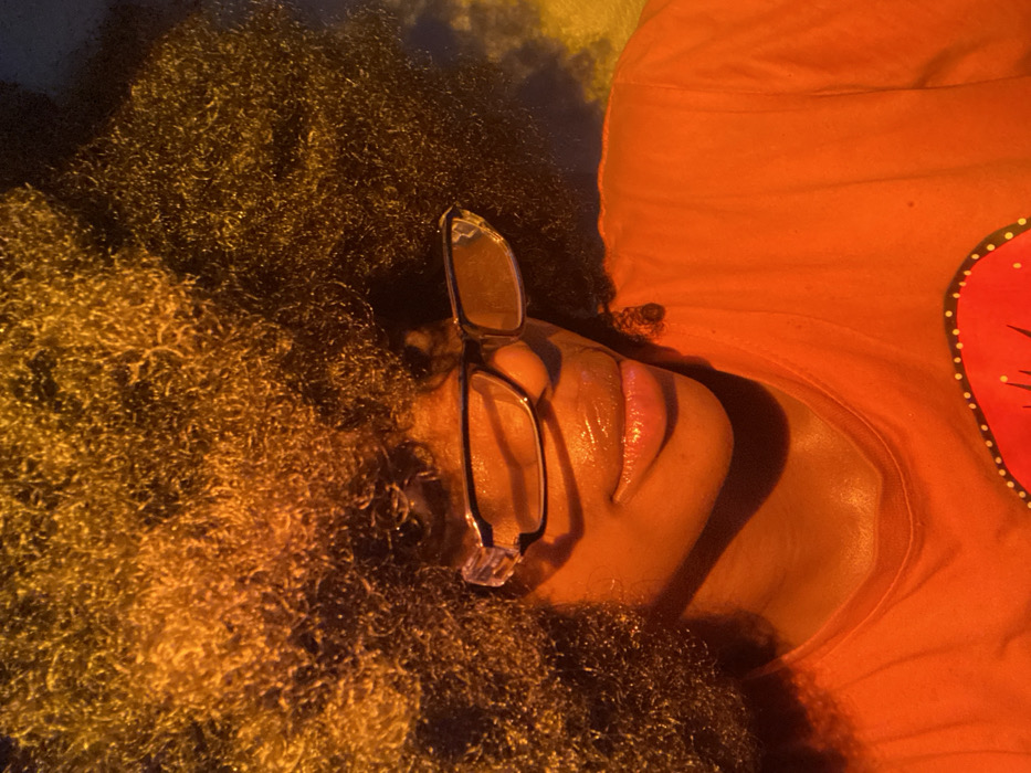 A person lies on their side, wearing an orange shirt with a red heart design. Close-up, the face shows glossy lips and skin reflecting warm light. Glasses perch on the cheek near the hairline. The hair, abundant and textured, is illuminated with golden light, contrasting with darker strands. A dark background surrounds the head.