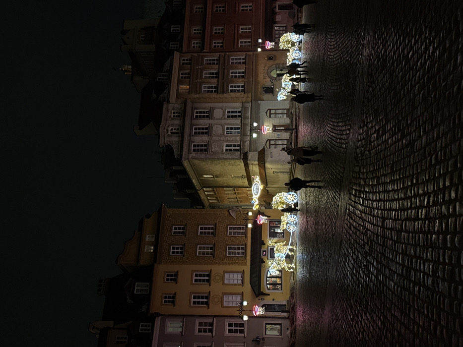Night scene depicting a street lined with buildings illuminated by warm light. Decorated carriages with lights add a festive touch. Silhouettes of people stroll along a cobblestone surface, reflecting the ambient light. The scene is mostly dark, but the building facades and lights create a contrast.