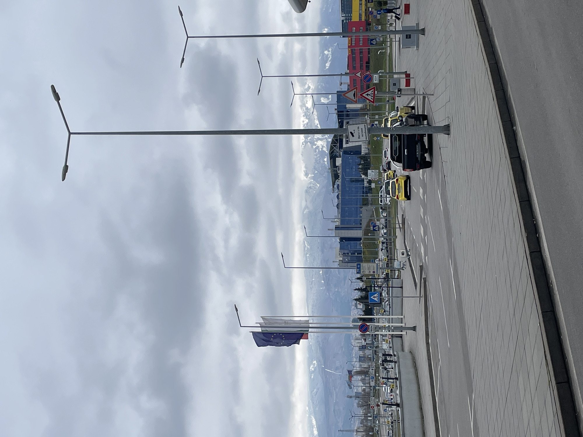 street scene in Sofia, Bulgaria. The foreground consists of a paved sidewalk and a street with parked vehicles, including taxis and other cars. The street is lined with lampposts and various road signs. Several flags, including the Bulgarian and European Union flags, are visible. In the background, there are buildings of various colors and architectural styles. Beyond the buildings, there is a view of a mountain range covered in snow. The sky is overcast with cloudy conditions.