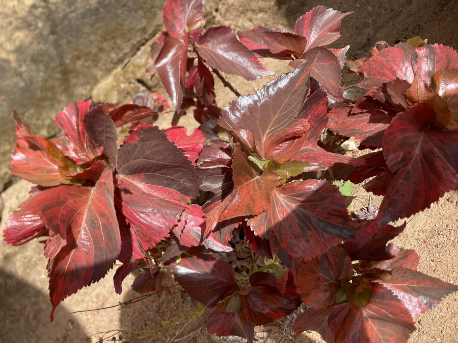 The image displays a close-up, ground-level view of a plant located in Rafin Bauna, Nigeria. The primary subject is a dense cluster of variegated foliage, likely from a Copperleaf plant (Acalypha wilkesiana). The leaves exhibit a striking color palette of deep reds, crimson, reddish-brown, and dark maroon, often with irregular patterns of lighter and darker pigmentation across individual leaves. The leaf margins appear to be serrated. Bright sunlight illuminates the scene from the upper left, casting distinct shadows on some leaves and creating reflective highlights on the glossy surfaces of others. The plant is rooted in light brown, sandy soil, which occupies the lower and left portions of the frame. A blurry, light-colored, textured surface, consistent with stone or concrete, is visible in the background along the right side. There are no individuals, animals, or other specific objects present within the immediate scene.