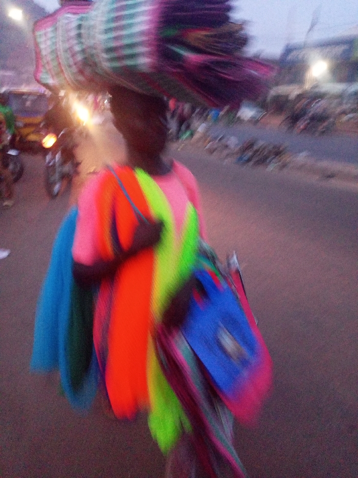A blurry image shows a person walking along a road carrying a large stack of items on their head. The individual wears a vibrant striped shirt and holds what appears to be bags. Motorcycles and other vehicles are visible in the background, adding to the busy scene. The image has a sense of motion, emphasizing the person's movement through the environment.