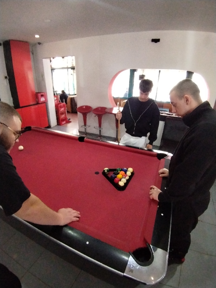 - "The scene depicts an interior view of a recreation area in Targovishte, Bulgaria, featuring a pool table surrounded by three male subjects" by FM-L5w9p2, licensed under CC BY 4.0