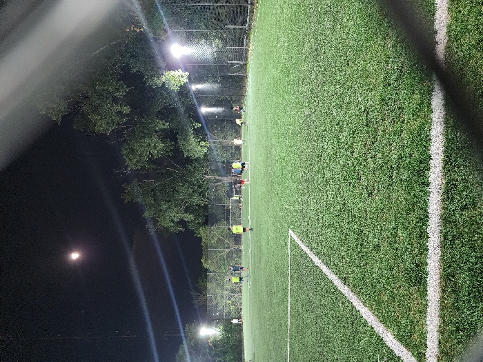 The image depicts a nighttime scene on an outdoor artificial turf soccer field, located in the city of Unknown, Unknown