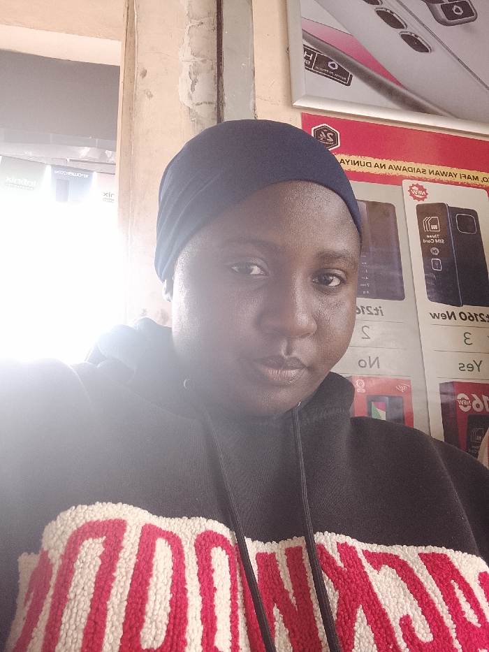 A single individual, appearing as an adult female, is depicted in a medium shot within an indoor retail setting in Fagge A, Nigeria. She is wearing a dark blue head covering and a black hooded sweatshirt with large, textured red and white lettering across the chest. Her expression is neutral, and she looks directly at the camera. To the subject's left, a bright, overexposed light source dominates, obscuring details but revealing faint, reversed reflections that include "Infinix" and "XBOX" branding. Adjacent to this light is a textured, light-colored wall or pillar exhibiting signs of wear. To the subject's right, a display wall features several laminated posters. The uppermost poster shows a close-up of a smartphone's rear camera array. Below it, a red poster contains partially reversed text and a visible "3S" logo. Further down, another poster advertises "NEW" mobile phones (such as "Itel") and "Three SIM Card" information, with elements like "No," "Yes," and "New" visible, often reversed. The overall environment suggests a mobile phone sales or service point.