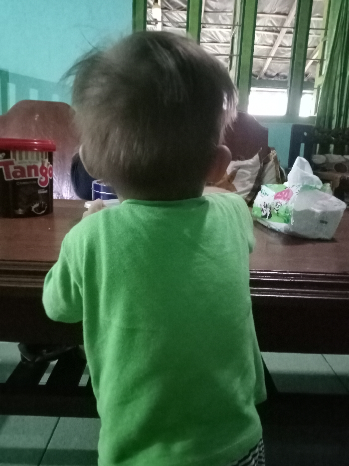 A toddler in a lime green shirt stands with their back to the camera, facing a wooden table. On the table, there is a tin of Tango chocolate wafers, a box of tissues, and a small container. The background features a window with green trim, partially covered by a curtain. A brown object sits near the Tango tin. The floor is covered with light-colored tiles.