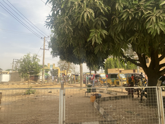 The image depicts a bustling street scene adjacent to the entrance of Government College in Badiko, Nigeria