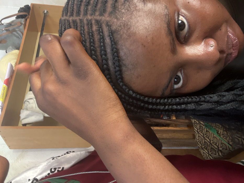 In an indoor setting in Gbongan, Nigeria, two individuals are present. A person, partially visible on the left, with dark skin and wearing a dark red garment with a white trim and a silver chain necklace, is actively braiding the hair of another person. The braider's right hand is prominently featured, manipulating dark hair into cornrows on the client's scalp. The client, also with dark skin, has their upper face and head angled, looking directly towards the viewer with wide eyes. A small silver stud piercing is visible on their right nostril. Their hair is partially styled in tight, parallel cornrows extending backward from the forehead, with loose, long black braids visible on the left side of their face. In the background, a light brown wooden shelf unit is visible, holding a white folded cloth, a light-colored object, a grey shoulder bag, and a red and white marker. A metal bar runs across the shelf unit. Below the client's head, a patterned fabric, possibly upholstery, is visible, with a green, comb-like object resting on it.