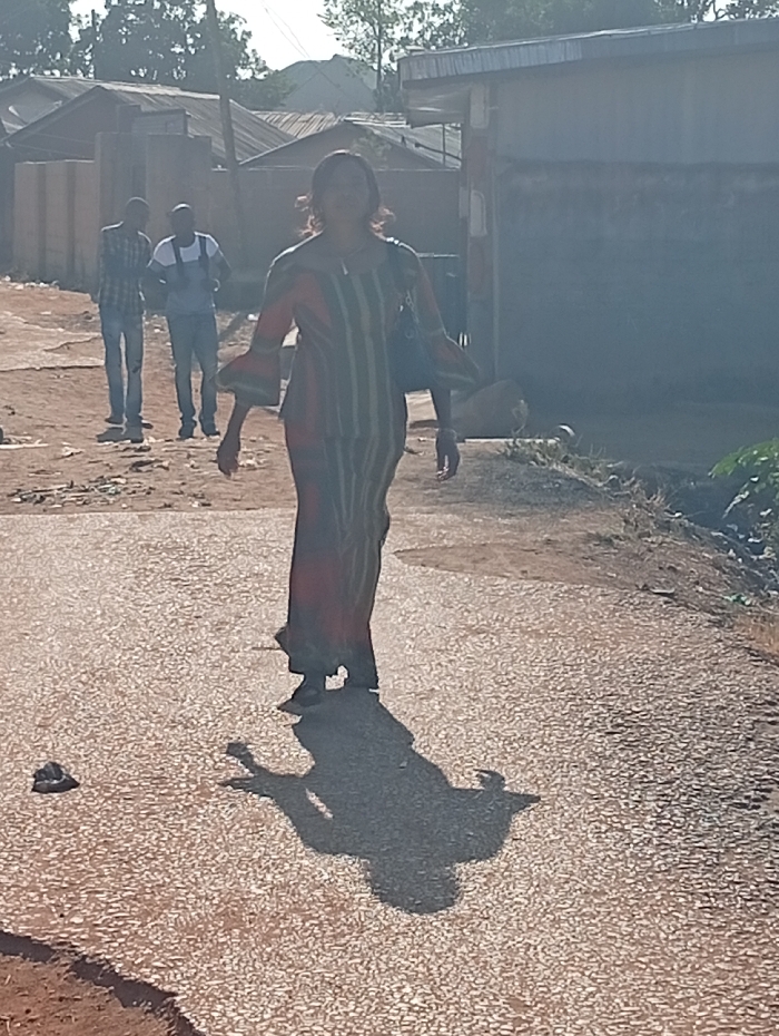 The image depicts an outdoor scene on a sunlit, textured pavement in Jos, Nigeria, likely within a residential or mixed-use area. A female subject, centered in the foreground, walks towards the viewer. She is dressed in a long, multi-patterned gown, possibly traditional African print, featuring vertical stripes in shades of red, green, and brown, with flared sleeves. A dark bag is slung over her left shoulder, and a necklace is visible. Her facial features are somewhat obscured by glare. A distinct, elongated shadow of the female subject extends onto the pavement directly in front of her. To the left in the background, two male subjects are visible. The male on the left wears a checkered long-sleeved shirt and jeans, while the male on the right wears a light-colored t-shirt and jeans, possibly with a backpack. Both males appear to be standing or slowly moving further down the path, facing away from the primary viewer's perspective. The ground consists of a rough, light brown paved surface with darker, unpaved dirt areas on the sides, where some sparse vegetation is visible. In the background, several single-story buildings with corrugated metal roofs and concrete block walls are visible, indicative of local architecture. Trees and distant structures are silhouetted against a bright sky, suggesting a clear day with strong sunlight creating harsh shadows. A small, dark object rests on the pavement near the female subject's shadow.