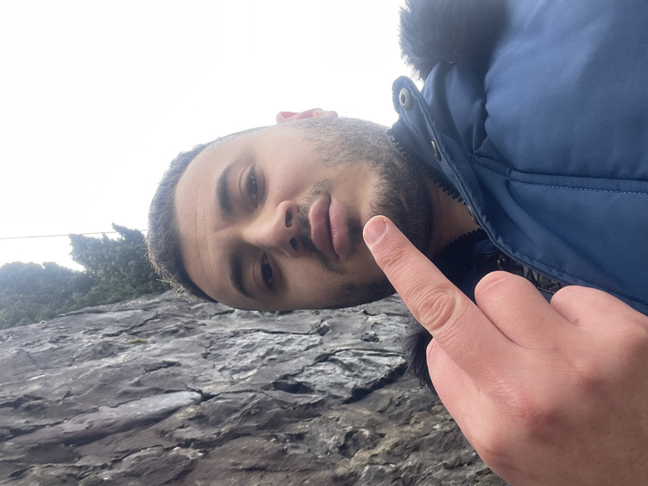 An outdoor portrait depicts an adult male from the waist up, centered slightly to the right of the frame. The male has short dark hair and a dark, trimmed beard and mustache. He is wearing a dark blue puffer-style winter jacket with a black fur trim visible around the hood on his right side. He looks directly at the camera with a neutral expression, his lips slightly pursed. His left hand is raised in the foreground, with the middle finger extended vertically, making a provocative gesture. The background to the left consists of a rugged, dark gray rock or stone wall exhibiting a coarse, textured surface. Above the wall, some sparse green foliage is visible. The upper right portion of the image shows an overcast, bright white sky. A thin, dark vertical line is faintly visible against the sky in the far upper right. The scene is located in Azpeitia, Spain.