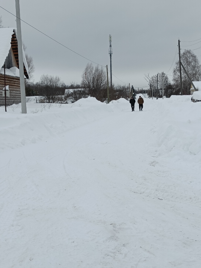 The image displays a snow-covered street in Nizhnii Bugrysh, Russia, under an overcast gray sky. A path, appearing cleared or worn through deep snow, extends into the distance, bordered by substantial snow banks on both sides. Tire tracks and footprints are visible on the snow-covered surface in the foreground. Two individuals are walking away from the viewer, positioned centrally on the path in the midground; one wears dark clothing, and the other wears a light brown jacket with dark trousers. To the immediate left, part of a wooden log building with a snow-covered roof and a white-framed window is visible, along with a white vertical pole. A tall metal cellular communication tower stands prominently in the distant midground, slightly left of the path's center. Bare deciduous trees, utility poles, and overhead power lines line both sides of the street, with additional snow-laden rooftops of structures discernible further down the road.