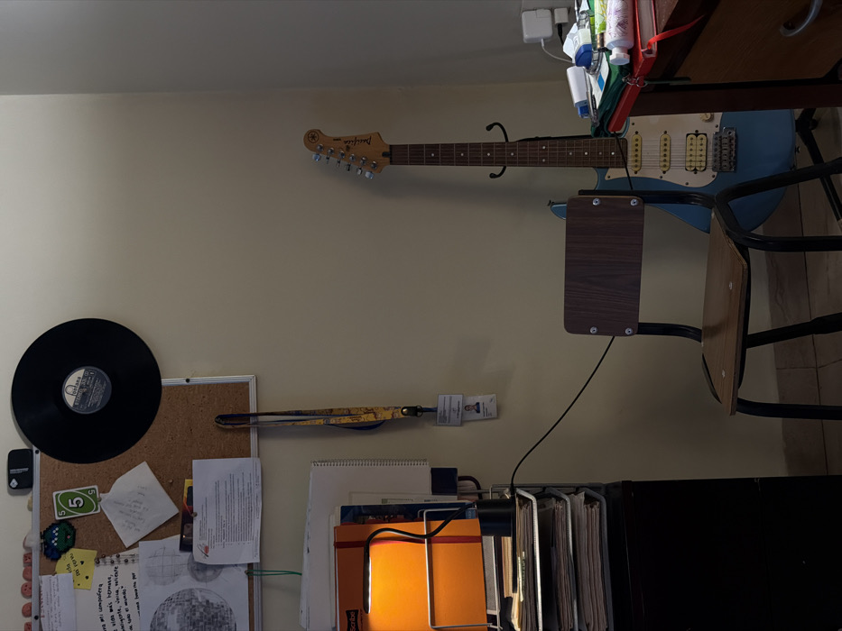 - "cluttered room with a guitar mounted on the wall, alongside a vinyl record attached to a bulletin board" by FM-tkmaw2, licensed under CC BY 4.0
