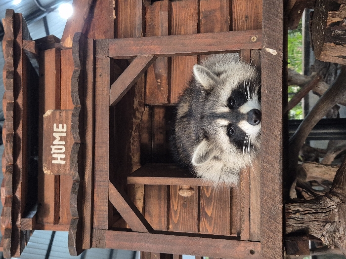 - "This close-up image depicts a single raccoon resting within a custom-built, multi-level wooden structure, presumed to be located in Thôn 5, Vietnam" by FM-vOprn2, licensed under CC BY 4.0