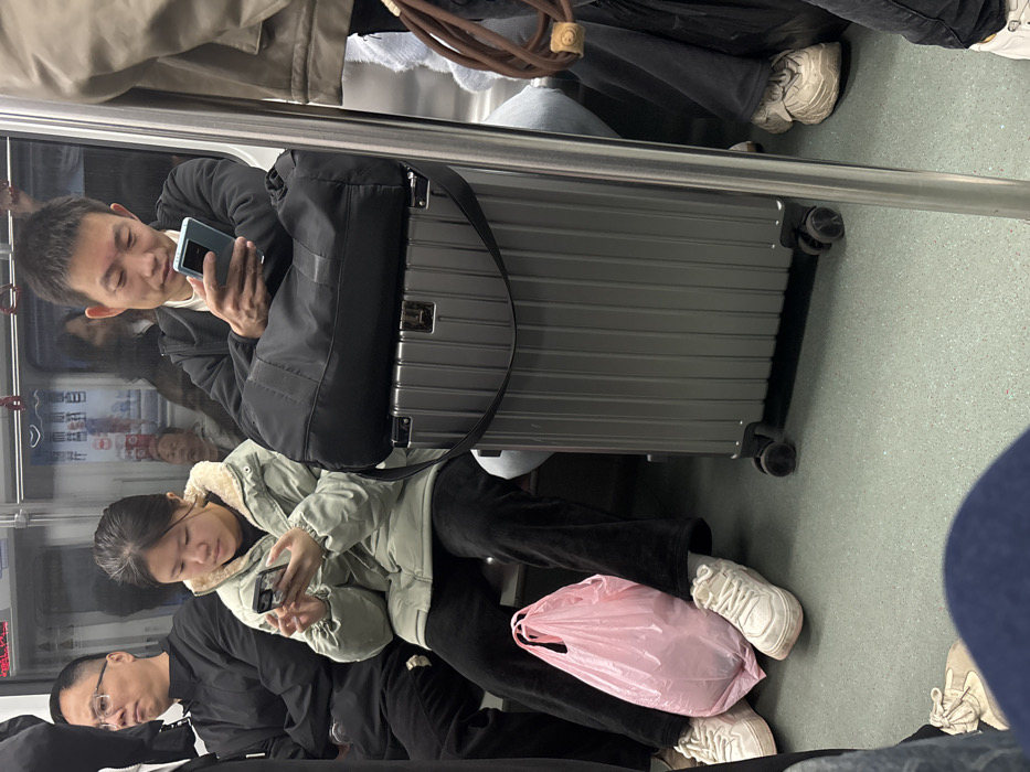 A group of people are seated on what appears to be a subway car. Three people are visible, each holding a phone. A woman in a light green puffer jacket sits next to a man wearing glasses, and another man sits above them, also looking at his phone. A large suitcase with a black bag on top sits beside the man in the green jacket. A pink plastic bag is on the floor near her feet.