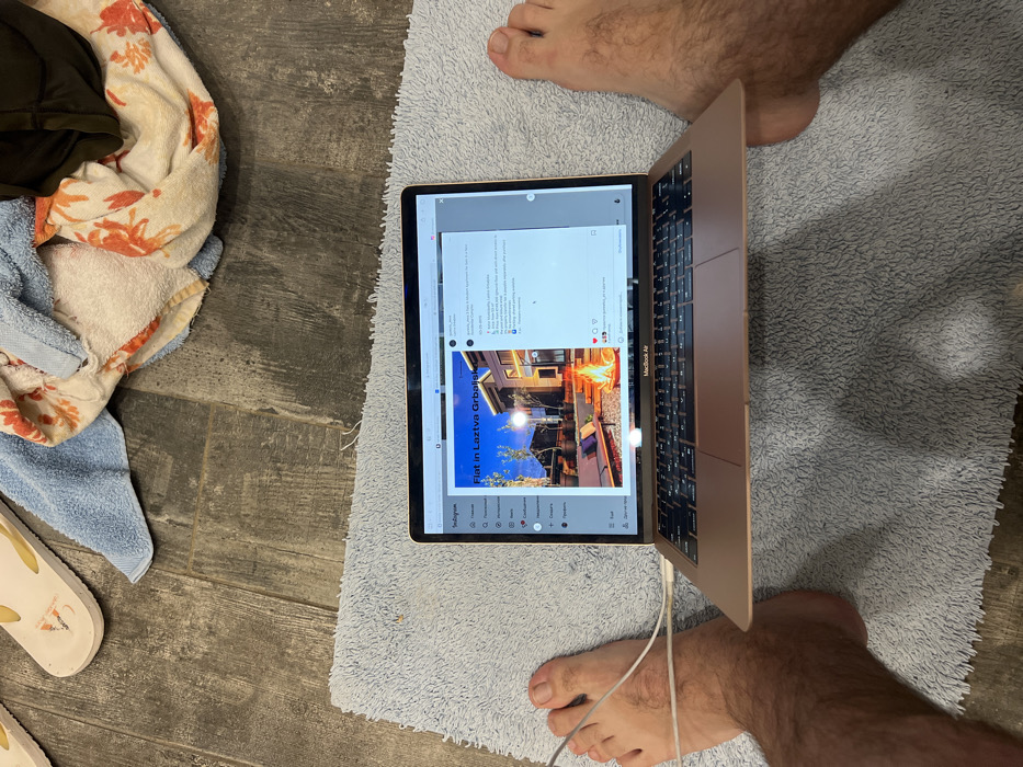 The scene is set on a dark tiled floor in Rafailovići, Montenegro, partially covered by a light blue, shaggy bath mat. Centrally, a rose gold MacBook Air laptop is open on the mat, displaying an Instagram post. The laptop is connected by a white charging cable to its left side. A person's bare, hairy legs and feet are visible on the mat, positioned on either side of the laptop. On the tiled floor in the upper left, a single white slipper with a yellow strap is present. In the upper right, several crumpled towels (blue, white with orange/red patterns) and a dark green bag are arranged. The laptop screen shows an image of a modern outdoor living space with a fire pit and seating, captioned "FLAT in Laztva Grbalj." Additional text on the screen refers to "Tivat Municipality, Lastva Grbalj" and a "New residential complex."