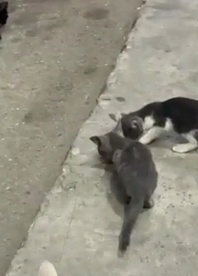 four kittens and one adult cat eating together on a concrete surface. One kitten is black, one is black and white, and two are gray. The adult cat is white and tan. A person sits in a chair in the background, looking at their phone. A black car is also visible in the background.