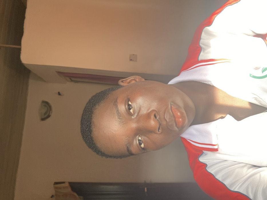 An individual with dark skin and short dark hair is captured in a close-up, chest-up shot