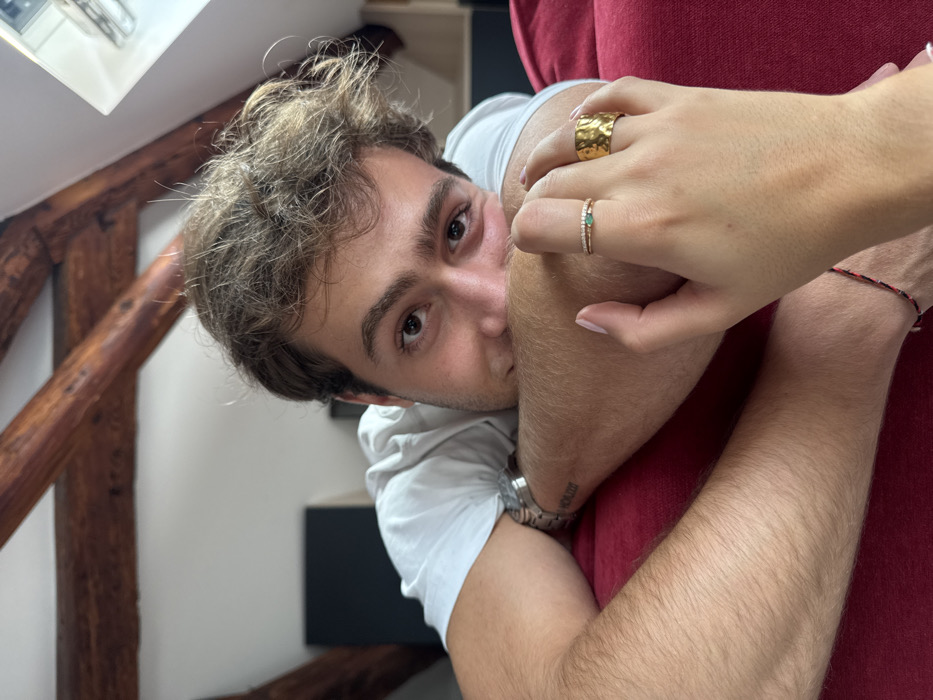 This image depicts an indoor scene located in Villeurbanne, France. A young adult male, with tousled brown hair, wearing a light-colored t-shirt, is positioned leaning on his left forearm. His face, exhibiting a slight smile, is partially obscured by his arm. A metal wristwatch is visible on his left wrist, and a tattoo of text is present on his left forearm. A light-skinned hand, displaying manicured nails with light polish, rests on his arm. This hand wears three rings: a thin band adorned with small clear stones, a thinner band featuring a small green oval stone, and a wide hammered gold-toned band. A red and black string bracelet is visible on the wrist of the resting hand. The subjects are situated on a reddish-maroon upholstered surface. The background consists of white walls, dark exposed wooden ceiling beams, a skylight in the upper right, and dark rectangular objects partially visible in the mid-left.